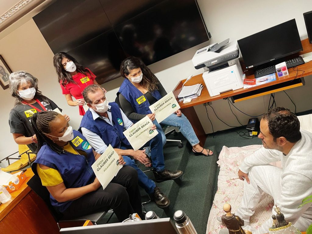 Desde que começou a greve de fome, Glauber Braga se mantém no Plenário 5 Câmara, local onde ocorreu a reunião do Conselho de Ética. Além de amigos e correligionários que se revezam para acompanhá-lo, ele também conta com o apoio da esposa, a deputada federal Sâmia Bonfim (Psol/SP), que leva o filho Hugo, de 3 anos, para visitá-lo.