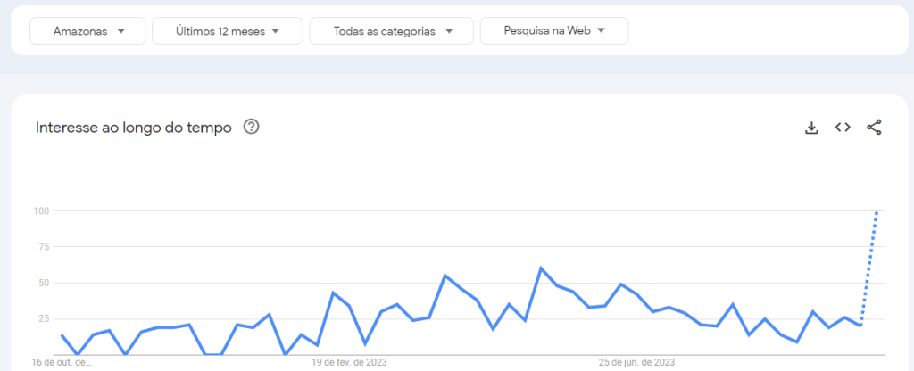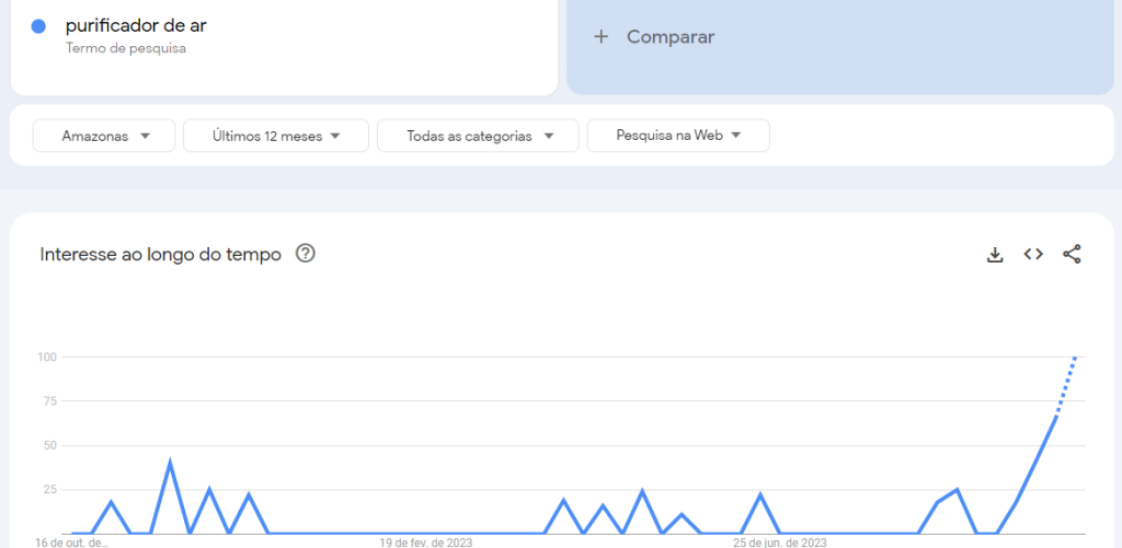 A ferramenta Google Trends mostra, na última semana, as buscas aumentaram 100% que foram aproximadamente 100 buscas por purificador de ar, de 1 a 7 de outubro, contra nenhuma busca na semana anterior. É a maior quantidade de buscas dos últimos 12 meses.