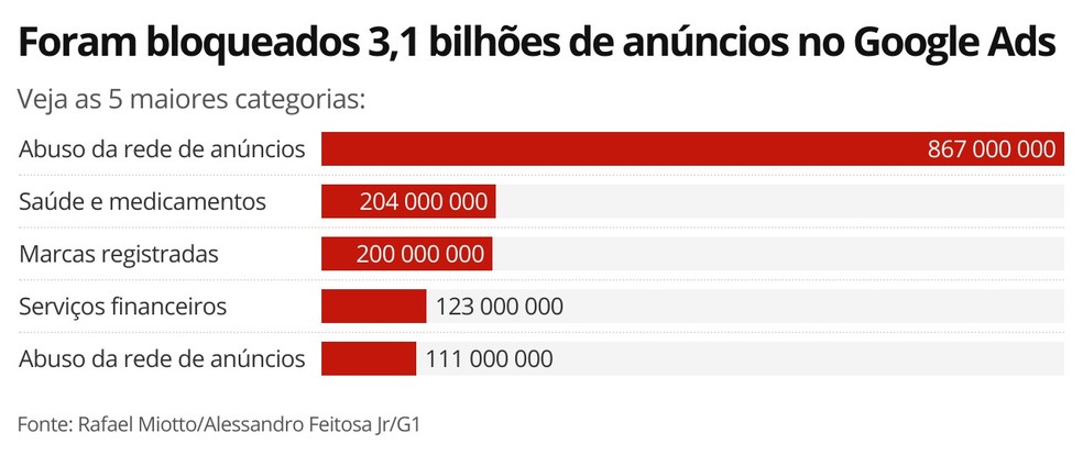 Segundo a companhia, foram bloqueados 3,1 bilhões de anúncios no total. Desses, a maioria estava relacionada com “abuso da rede de anúncios”, quando um banner pode levar a pessoa para um site que contém vírus ou que mostra conteúdos diferentes para usuários diferentes no mesmo site.