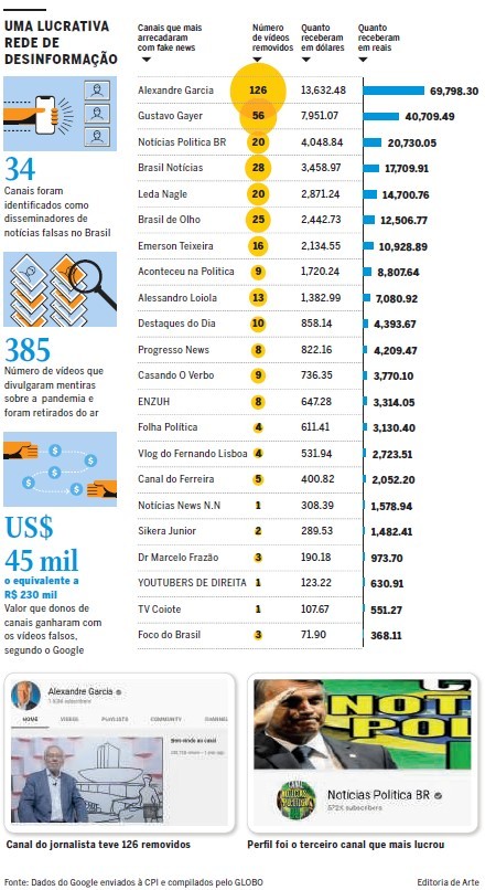 A pedido da comissão, a empresa de tecnologia forneceu uma lista de 385 vídeos removidos pelo Youtube ou deletados pelos próprios usuários após serem identificados como disseminadores de desinformação sobre formas de tratamento para a Covid-19 ou a pandemia. A listagem foi acompanhada de quanto cada publicação rendeu aos donos dos canais até saírem do ar.