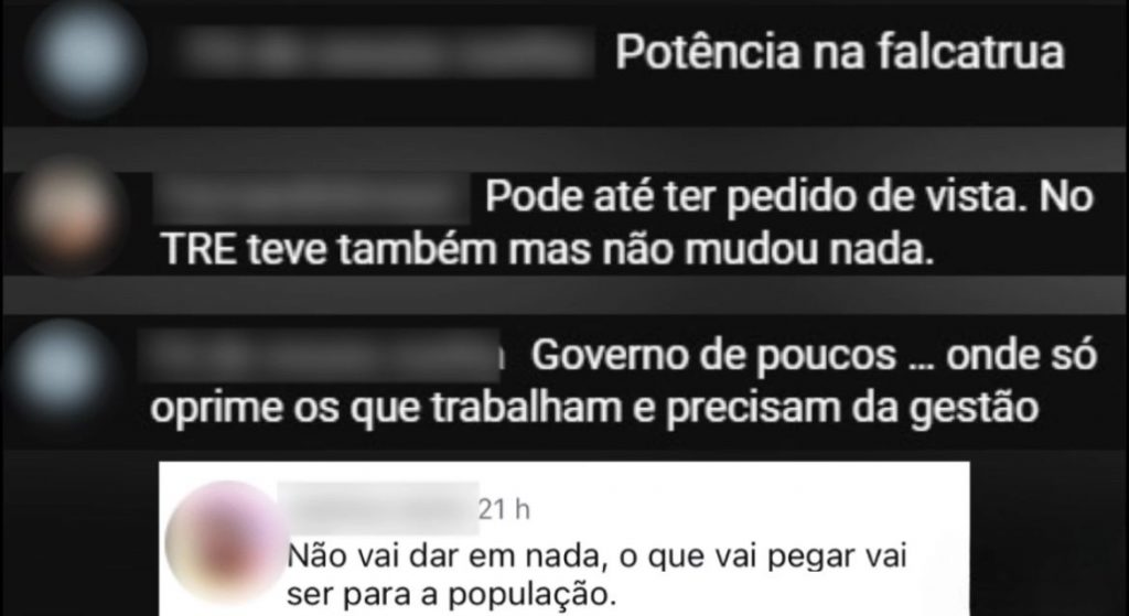 Por outro lado, entre os comentários contrários ao grupo político de Denarium e à suspensão da do julgamento no TSE, frases como: “Não acredito que a justiça parou” e “Não vai dar em nada, o que vai pegar vai ser a população […]” foram amplamente repercutidas.
