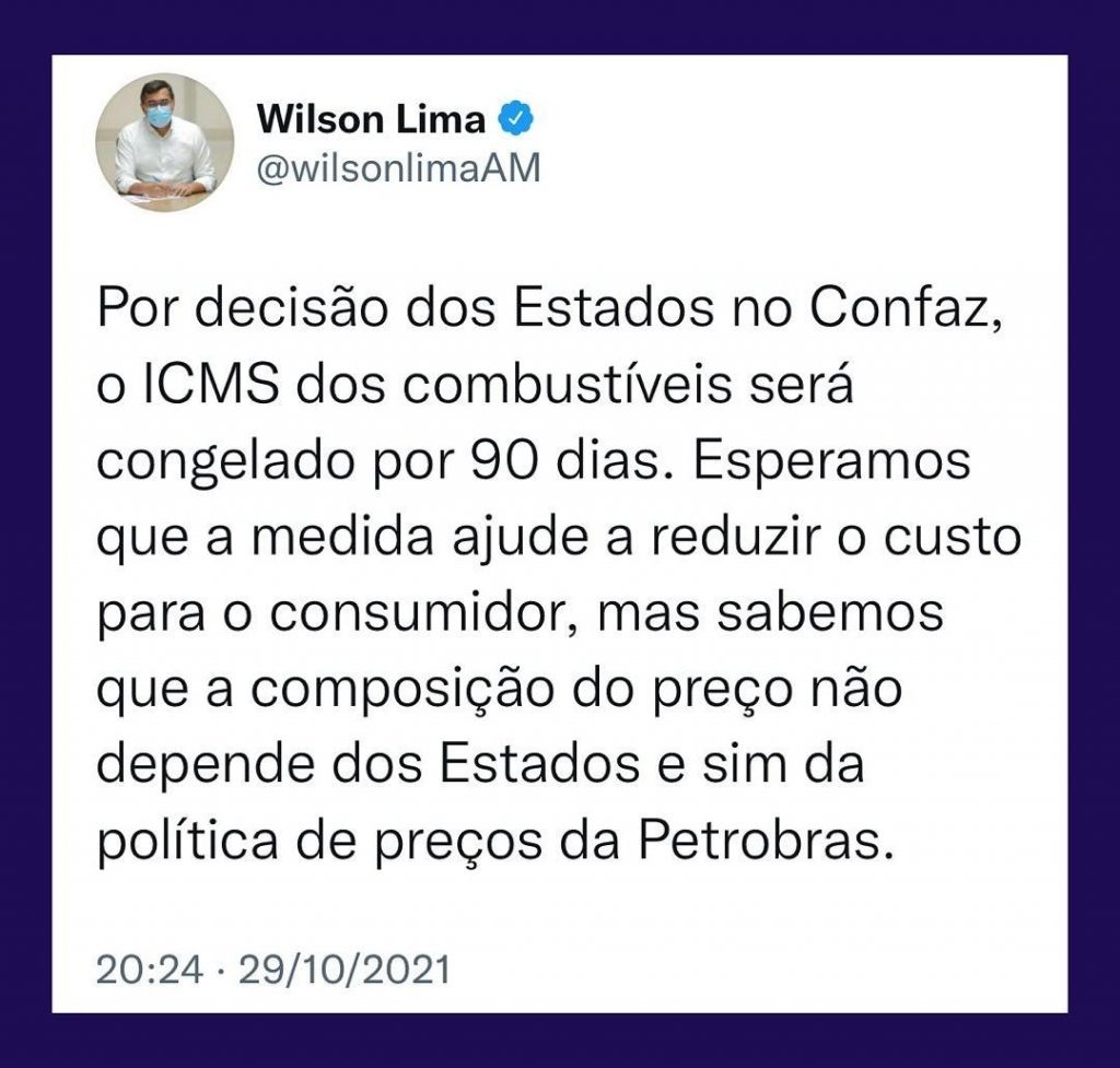 MANAUS – O governador do Amazonas, Wilson Lima (PSC), se manifestou nessa sexta-feira, 29, em relação ao preço do Imposto sobre Circulação de Mercadorias e Serviços (ICMS). Em uma publicação no Instagram, Lima comenta que o congelamento do imposto pelos estados, apesar de representar uma ferramenta para auxiliar na redução do valor dos combustíveis, não garante a baixa do preço – que depende de outros fatores.