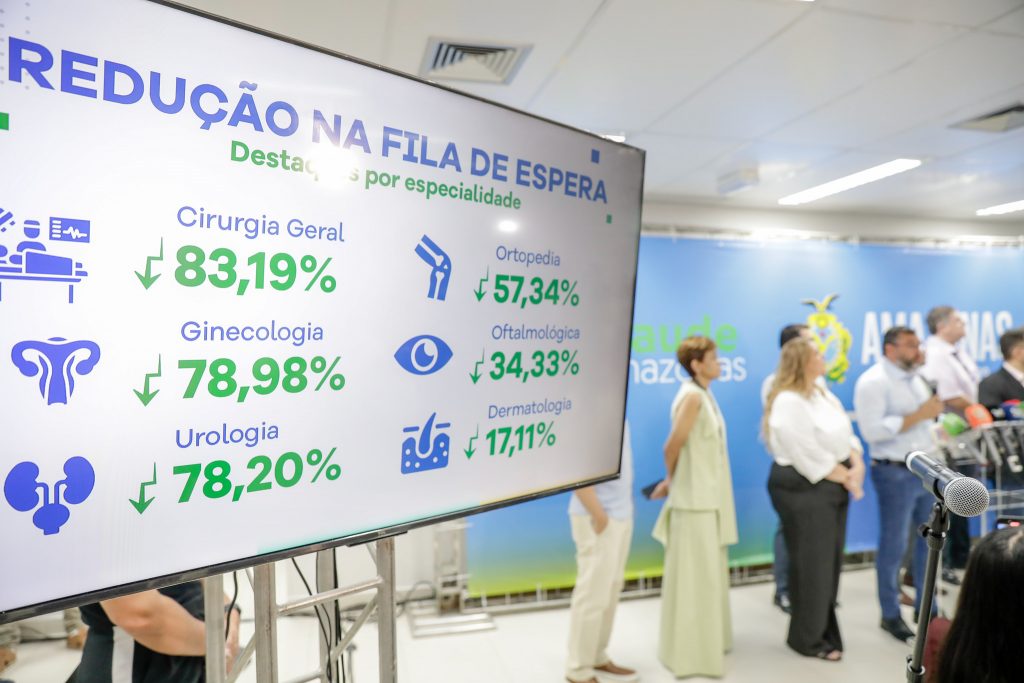 Na apresentação do balanço, o governador destacou a redução significativa nas filas de espera para cirurgias em diversas especialidades. Segundo os dados divulgados, a maior queda foi registrada em cirurgia geral, com diminuição de 83,19%, seguida por ginecologia (78,98%) e urologia (78,20%).