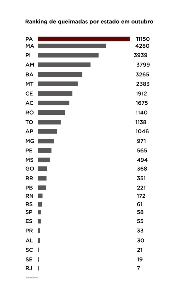 Dados do Instituto Nacional de Pesquisas Espaciais (Inpe), divulgados no dia 31 de outubro pela REVISTA CENARIUM AMAZÔNIA, apontaram que Pará é o campeão em queimadas no mês de outubro. Foram registrados 11.150 focos de incêndios florestais do dia 1° até o dia 31 do mês.