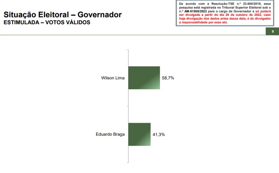 MANAUS – No Amazonas, os eleitores parecem determinados a não permitir que o senador Eduardo Braga (MDB) retorne ao governo do Estado. Levantamento realizado pelo Instituto Paraná Pesquisas aponta que o atual governador, Wilson Lima (União Brasil), abriu 17,4 pontos de vantagem, somando 58,7% dos votos válidos, contra 41,3% do rival. No cenário espontâneo, Wilson tem 47,5% contra 31,4%, 16,1 pontos à frente, e na estimulada ele abriu vantagem de 15,6 pontos: 52,7 a 37,1%.