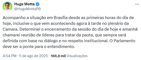 Às 17h54 (horário de Brasília), Hugo Motta se manifestou por meio do seu perfil no X (ex-Twitter). Na mensagem, o chefe da Câmara afirmou que monitora a situação em Brasília desde as primeiras horas desta terça-feira e que determinou o encerramento da sessão do dia. De acordo com o deputado, uma reunião com os líderes dos partidos deve ocorre nessa quarta-feira, 6.