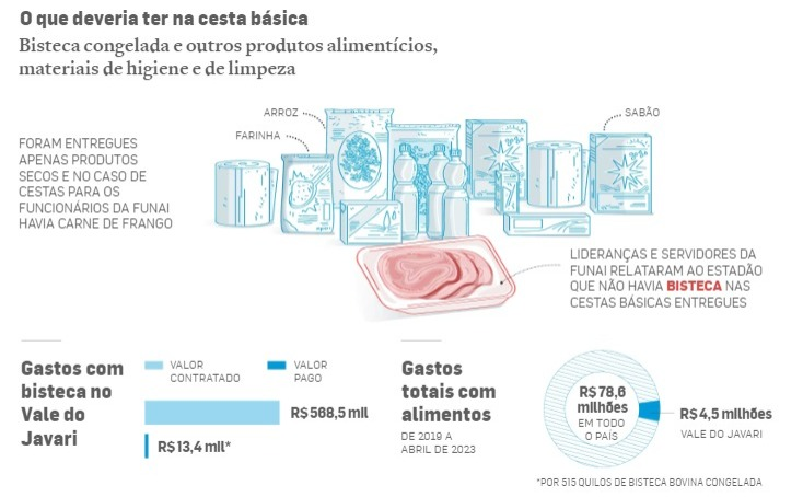 O sumiço das bistecas foi confirmado ao Estadão pelos indígenas que deveriam receber o produto e por um comerciante que deveria enviá-lo. Até a funcionária da Funai que assinou o contrato de compra fala em desperdício de dinheiro público, mas alega que seguia ordens de seus superiores. “Nem tudo que constitui a cesta básica contempla uma alimentação específica desses indígenas. Era um desperdício, realmente, do dinheiro público”, admitiu Mislene Metchacuna Martins Mendes, atual diretora de administração e gestão da Funai. “Parte dos alimentos chegava sem condições para consumo, mas a ordem era entregar”, disse ela.