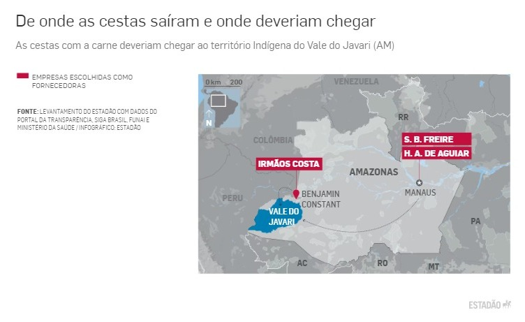 Após selecionar as empresas para fornecer a carne no Vale do Javari, o governo efetuou pagamentos que somaram R$ 13,4 mil para a compra de meia tonelada de bistecas. Duas empresas que ganharam as licitações ficam em Manaus (AM), a mais de 1 mil quilômetros das cidades que dão acesso ao território indígena.
