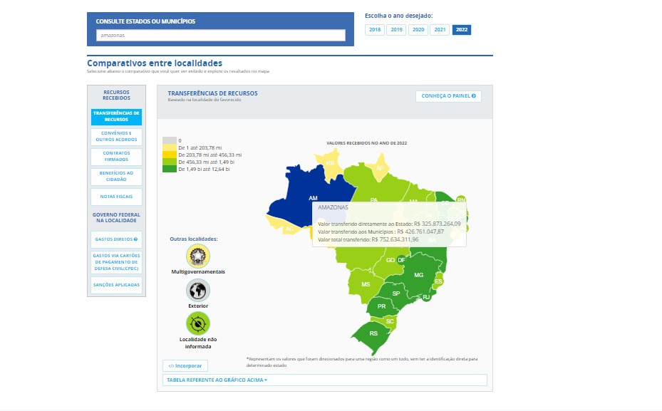 MANAUS – O governo federal transferiu ao Amazonas, no primeiro quadrimestre deste ano, R$ 752,63 milhões, contabilizando os repasses feitos ao Estado e aos 62 municípios. Se comparado à média quadrimestral de 2021, que ficou em R$ 3,20 bilhões, o valor é 76,50% menor, conforme mapa por localidade e favorecido, disponível no Portal da Transparência, gerido pela Controladoria-Geral da União (CGU).
