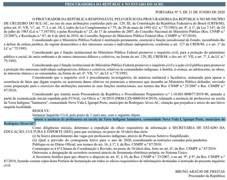 O documento foi assinado pela procurador da República Bruno Araújo de Freitas, que pediu ainda ao governo do Acre se houve preenchimento das vagas por professores indígenas, por meio de Processo Seletivo Simplificado e qual a previsão do cronograma letivo para o ano de 2020, considerando as restrições causadas pela pandemia.