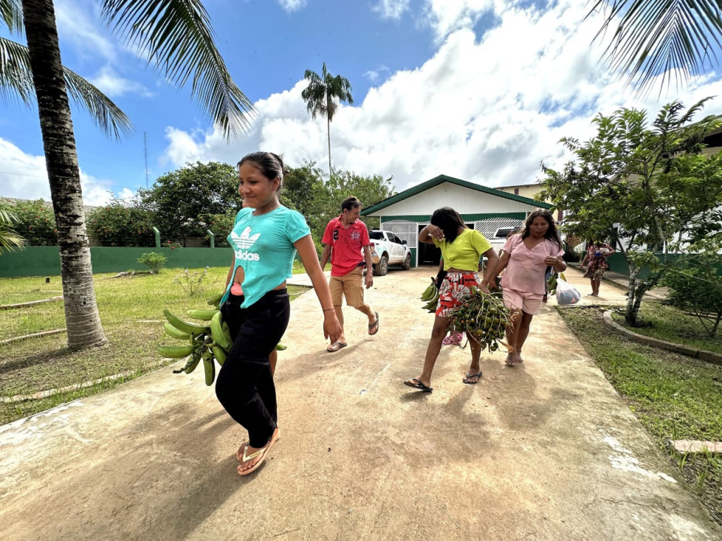 A distribuição de alimentos inclui frutas como goiaba, mamão e banana, além de legumes e hortaliças. Em algumas localidades também são entregues proteínas, como o pirarucu fresco.