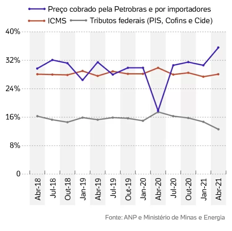Compartilhando o mesmo percentual do ICMS, a nível nacional, estão Santa Catarina e São Paulo. Os números foram divulgados pelo site Valor Econômico a partir de informações da Agência Nacional do Petróleo, Gás Natural e Biocombustíveis (ANP) e Ministério de Minas e Energia, que apontam, que em abril de 2021, a participação do preço cobrado pela Petrobras é maior que a porcentagem do Imposto sobre Circulação de Mercadorias e Serviços (ICMS), que chega a quase 40%.