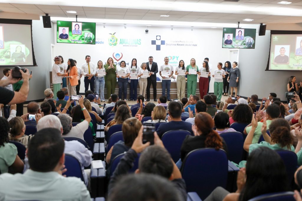 Durante a cerimônia, um grupo de profissionais que integram as equipes multidisciplinares do Hospital Delphina Aziz na área de transplantes recebeu certificados e troféus de reconhecimento pelo trabalho realizado em um ano. Os homenageados são de diversas áreas como técnicos de enfermagem, enfermeiros, médicos, psicólogos e assistentes sociais.