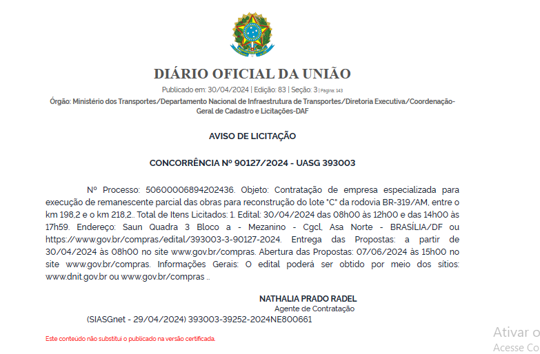 O objeto da licitação, cuja obra será realizada por meio do Departamento Nacional de Infraestrutura de Transportes (Dnit), corresponde à “Contratação de empresa especializada para execução de remanescente parcial das obras para reconstrução do lote “C” da rodovia BR-319/AM, entre o km 198,2 e o km 218,2“.