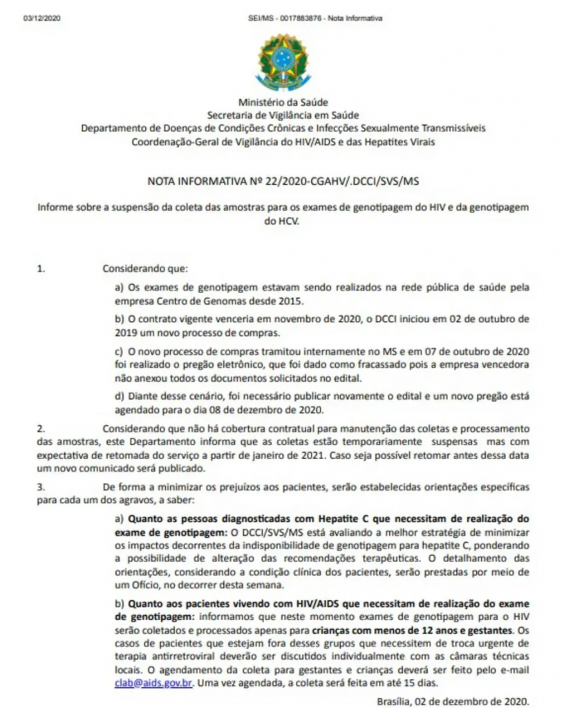 Em nota distribuída a serviços de saúde no último dia 3, o ministério afirma que fará este exame apenas para crianças com menos de 12 anos e gestantes que vivem com HIV e aids. Já os pacientes de hepatite C devem receber os medicamentos velpatasvir e sofosbuvir, que são mais eficazes e dispensam a genotipagem. O HIV é o vírus causador da aids, doença que ataca células do sistema imunológicos. Ter HIV, porém, não significa que a pessoa desenvolverá aids.