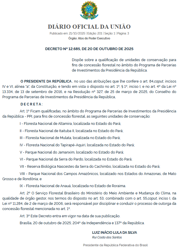 BRASÍLIA (DF) – O presidente Luiz Inácio Lula da Silva (PT) assinou o Decreto 12.685 que qualifica nove unidades de conservação localizadas nos Estados do Pará, Amazonas, Mato Grosso, Rondônia e Roraima, para fins de concessão florestal no âmbito do Programa de Parcerias de Investimentos (PPI) da Presidência da República. O decreto foi publicado no Diário Oficial da União (DOU) desta terça-feira, 21, e visa atrair a iniciativa privada para gerir e investir no manejo sustentável e na recuperação de áreas degradadas.
