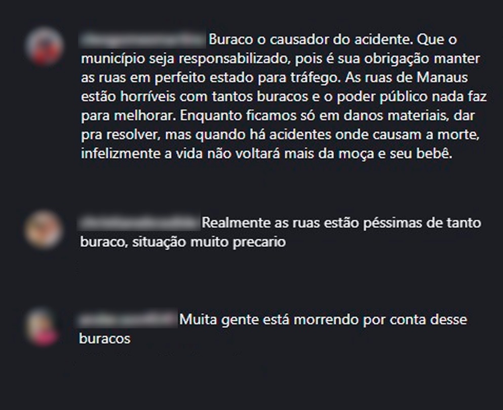 Outro usuário de uma rede social afirmou que essa não é a primeira vez que um acidente fatal é causado por um buraco nas ruas de Manaus. “Muita gente está morrendo por conta desses buracos“, afirmou.