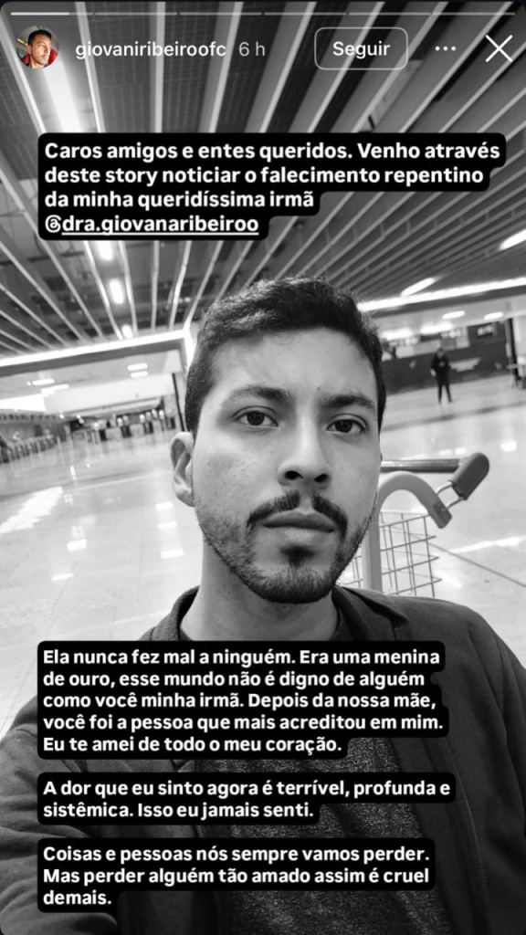 Outro irmão de Giovana, identificado como Giovani Ribeiro, lamentou a morte da biomédica e falou do sentimento de perda. “Ela nunca fez mal a ninguém. Era uma menina de ouro, esse mundo não é digno de alguém como minha irmã. Depois da nossa mãe, foi a pessoa que mais acreditou em mim. A dor que eu sinto agora é terrível, profunda“, declarou.