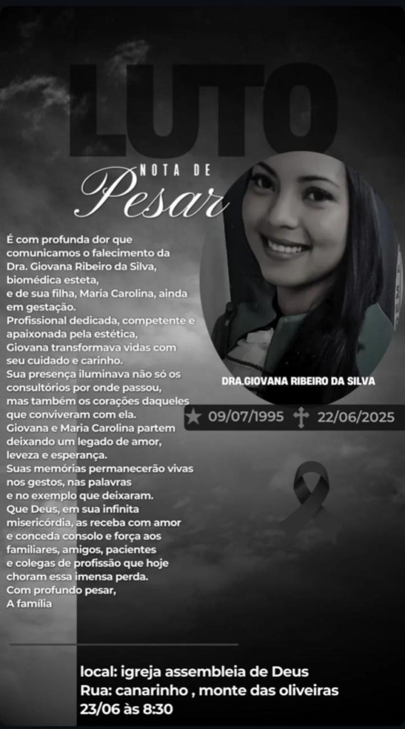 “É com profunda dor que comunicamos o falecimento da Dra. Giovana Ribeiro da Silva, biomédica esteta, e de sua filha, Maria Carolina, ainda em gestação. Profissional dedicada, competente e apaixonada pela estética, Giovana transformava vidas com seu cuidado e carinho. Sua presença iluminava não só os consultórios por onde passou, mas também os corações daqueles que conviveram com ela. Giovana e Maria Carolina parte deixando um legado de amor, leveza e esperança“, diz um trecho da nota de pesar.
