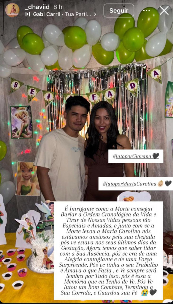 O cunhado de Giovana, Michel Jardim Corrêa, lembrou que ela era uma pessoa de coração lindo e gentil. “Uma pessoa tão maravilhosa, de coração lindo, uma pessoa tão gentil e carinhosa. Estávamos aqui esperando a nossa Maria Carolina que seria nossa alegria”, disse.