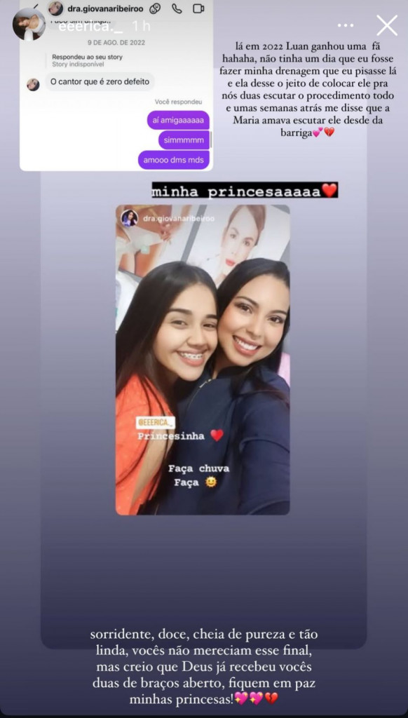 A amiga e paciente de Giovana, Erica Lima, também lamentou a perda da profissional e afirmou que a pequena Maria Carolina teve sorte de ser gerada por Giovana. “Tão cheia de amor e doçura, a Maria teve tanta sorte em ter você como mãe. Você como sempre guerreira. Sorridente, doce, cheia de pureza e tão linda, vocês não mereciam esse final“, disse.