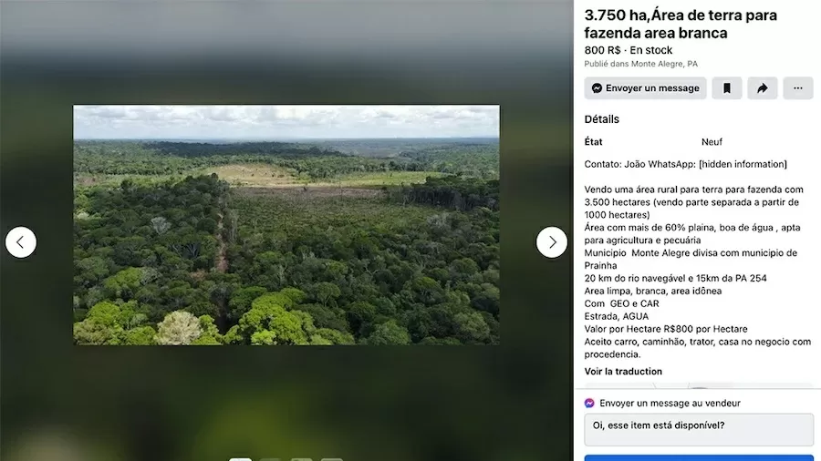 Um dos vendedores que oferecem terras na Amazônia a preços baixos se identifica como João. A equipe do Forbidden Stories fez contato com ele se passando como potencial cliente. Por R$ 1.200 por hectare, um preço três vezes inferior ao preço médio da terra na região de Almeirim, no norte do Pará. João oferta fazendas que podem chegar a 8 mil hectares (ou mais de 8 mil campos de futebol).