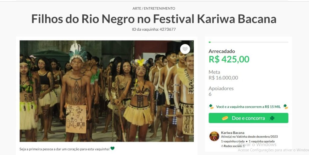 A doação pode ser feita no link https://www.vakinha.com.br/vaquinha/filhos-do-rio-negro-no-festival-de-musica-kariwa-bacana/contribua ou por meio da chave Pix 4273677@vakinha.com.br. As formas de pagamento são cartão de crédito, Pix ou boleto. Qualquer valor pode ser doado.