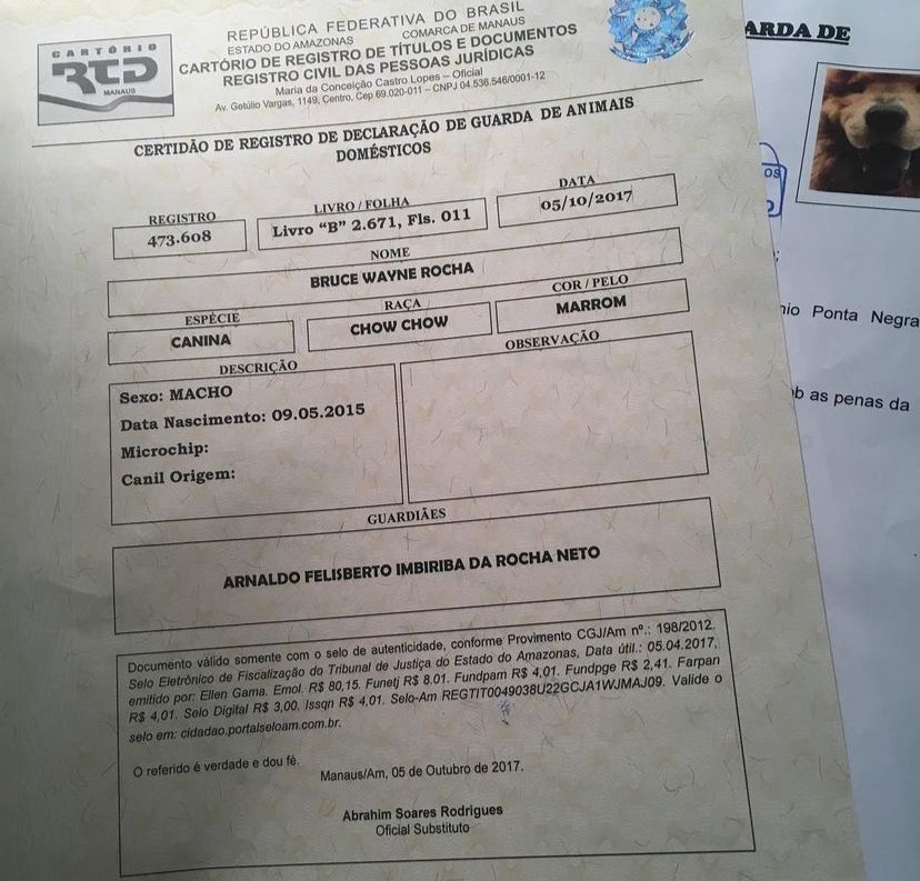 “Depois de alguns dias após essa reunião, ele considerou que o melhor era que o Bruce ficasse comigo. A reunião foi extrajudicial, mas depois que ele topou abrir mão, fui ao cartório fazer o registro de posse, que é bem interessante e deveria ser uma obrigação, porque você assina um documento e ganha uma certidão, onde você tem obrigações de manter o animal saudável, bem alimentado, vacinado, seguro, com visitas regulares ao médico veterinário, e é responsabilizado por qualquer situação de maus-tratos com o animal ou qualquer prejuízo que ele cause para outra pessoa”, completa Rocha.