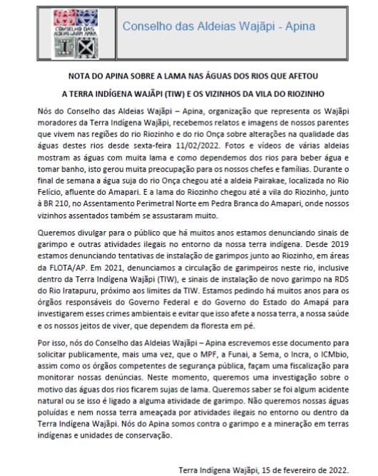 “Fotos e vídeos de várias aldeias mostram as águas com muita lama e como dependemos dos rios para beber água e tomar banho, isto gerou muita preocupação para os nossos chefes e famílias. Durante o final de semana, a água suja do rio Onça chegou até a aldeia Pairakae, localizada no Rio Felício, afluente do Amapari. E a lama do Riozinho chegou até a Vila do Riozinho, junto à BR-210, no Assentamento Perimetral Norte, em Pedra Branca do Amapari, onde nossos vizinhos assentados também se assustaram muito”, diz trecho da nota.