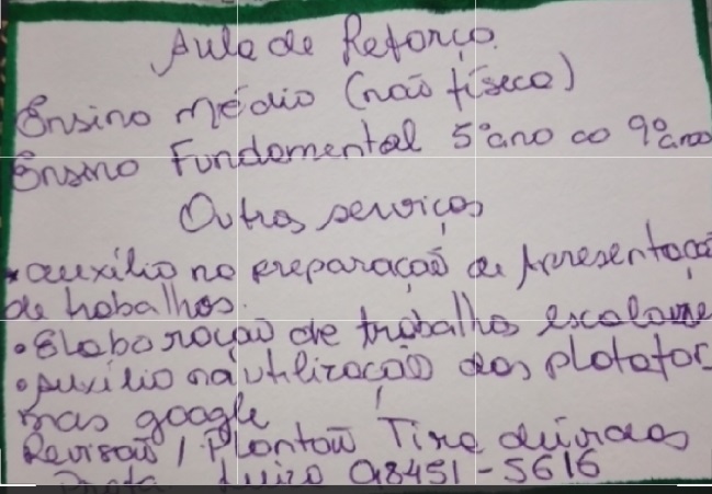 “Eu penso que temos que lutar sempre e nos reinventar. Fiz esses informativos à mão e distribuí, na tentativa de atrair alguns futuros interessados, pois, estamos em tempos muito difíceis e precisamos sobreviver, buscar novos meios para obter recursos e, assim, honrar nossos compromissos”, comentou a professora.
