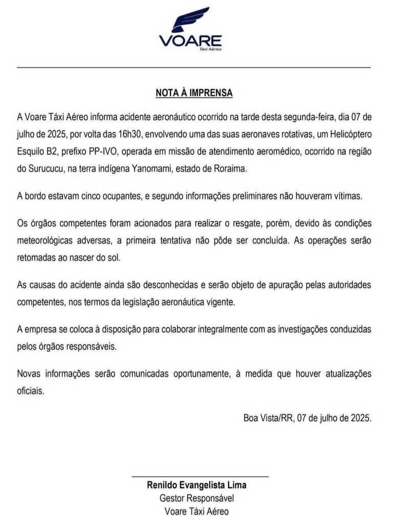 MANAUS (AM) – Equipes de busca e salvamento estão desde segunda-feira, 7, tentando chegar ao local no qual uma aeronave da Voare Táxi Aéreo sofreu um acidente no período da tarde. Segundo reportado em comunicado pela própria Voare, sua aeronave de matrícula PP-IVO, um helicóptero Esquilo B2, sofreu o acidente durante um resgate aeromédico em Surucucu, na Terra Indígena Yanomami, no estado de Roraima.