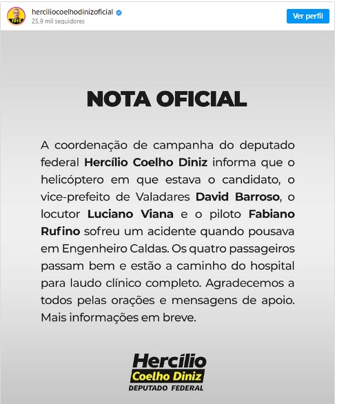 Além de deputado federal, Hercílio Coelho Diniz é dono da rede de supermercados Coelho Diniz, popular na região do leste de Minas. Veja abaixo a nota divulgada pela sua campanha: