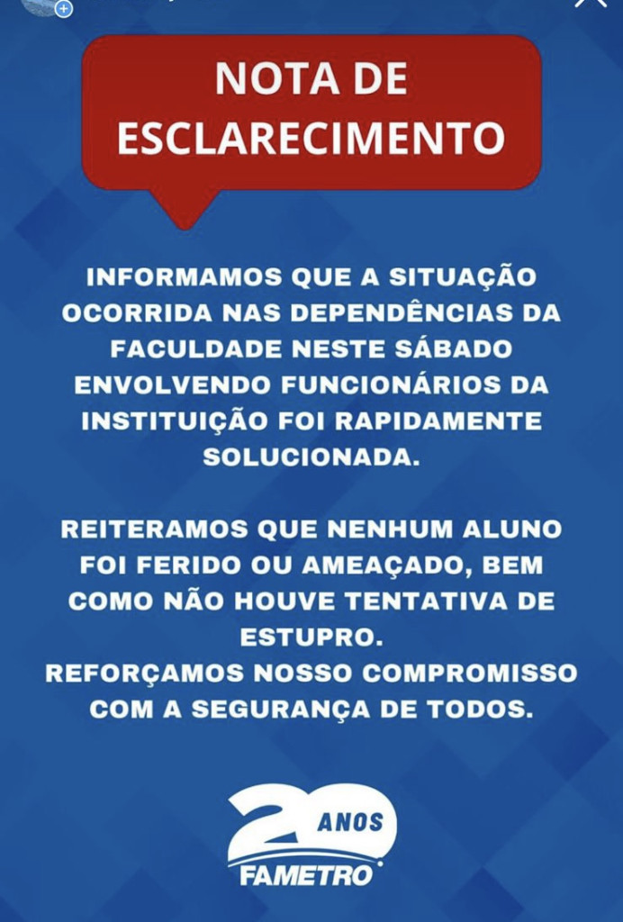 Em nota, a instituição afirmou que a situação foi rapidamente controlada. A Fametro disse, ainda, que nenhum aluno foi ferido ou ameaçado e descartou a tentativa de estupro.