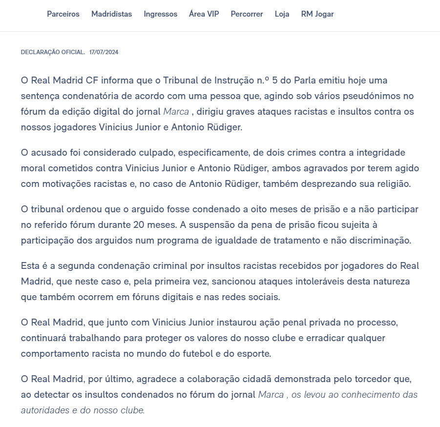 “O acusado foi considerado culpado, especificamente, de dois crimes contra a integridade moral cometidos contra Vinicius Junior e Antonio Rüdiger, ambos agravados por terem agido com motivações racistas e, no caso de Antonio Rüdiger, também desprezando sua religião”, diz um trecho da nota oficial publicada pelo Real Madrid.