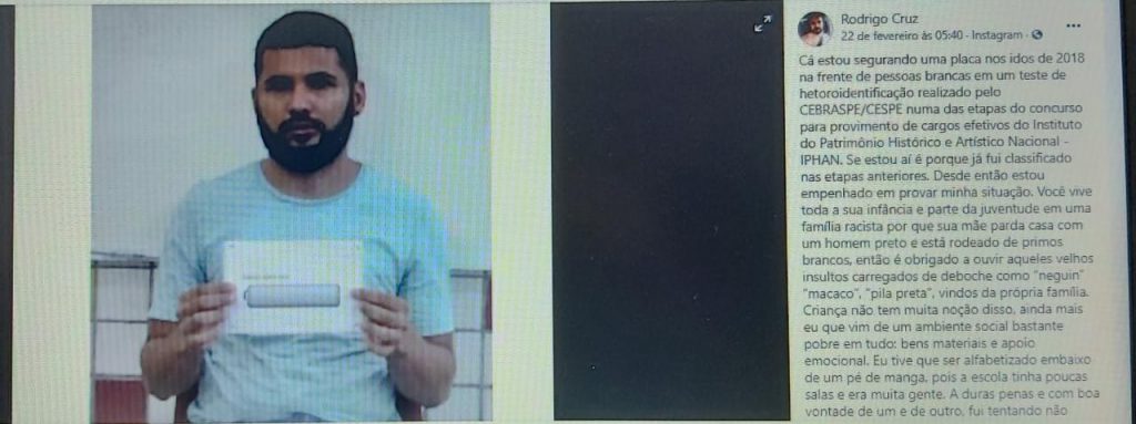“Cá estou segurando uma placa em 2018 na frente de pessoas brancas em um teste de hetoroidentificação realizado pelo Cebraspe/Cespe numa das etapas do concurso para provimento de cargos efetivos do Instituto do Patrimônio Histórico e Artístico Nacional – Iphan”, diz revoltado.