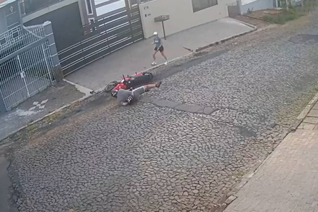 Um vídeo mostra o homem passando a mão no corpo de uma mulher que caminhava em uma rua do bairro Oficinas. A ação foi registrada por uma câmera residencial. Na sequência, ele se desequilibra e cai da motocicleta.