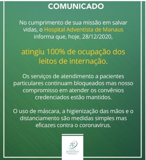 MANAUS – Em uma publicação nas redes sociais nesta segunda-feira, 28, o Hospital Adventista de Manaus (HAM) anunciou o atingimento de 100% de ocupação dos leitos destinados a pacientes com Covid-19. A rede particular é a segunda da capital amazonense a declarar lotação máxima, em menos de 24 horas, após o Hospital Santa Júlia também declarar a mesma situação.