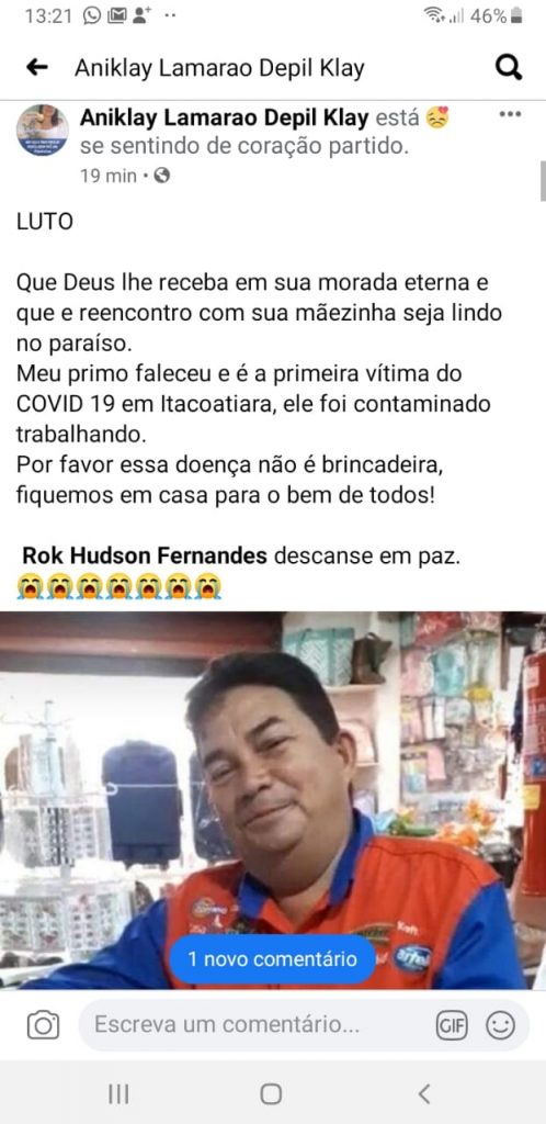 O diretor clínico do Hospital Regional José Mendes, do município de Itacoatiara (a 270 quilômetros da capital), Dr. Marlon Amaral, confirmou nesta sexta-feira, 17, à REVISTA CENARIUM, a primeira morte pelo Novo Coronavírus na cidade.