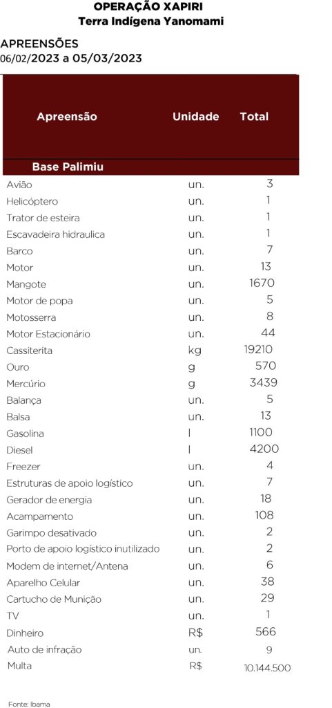 O balanço divulgado mostra que já foram aplicados mais de R$ 10 milhões em multa, além da apreensão de 19.210 quilos de cassiterita, 570 gramas de ouro, 3.439 gramas de mercúrio, entre outros materiais apreendidos ou destruídos pelos agentes. O total de 108 acampamentos onde ficavam os garimpeiros foram desarticulados.