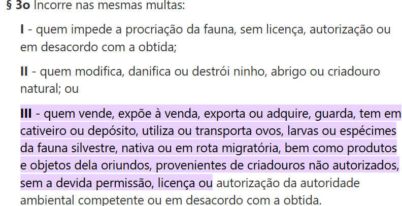 Segundo o artigo 29 da Lei 9.605/1998, “quem vende, expõe à venda, exporta ou adquire, guarda, tem em cativeiro ou depósito, utiliza ou transporta ovos, larvas ou espécimes da fauna silvestre, nativa ou em rota migratória, bem como produtos e objetos dela oriundos, provenientes de criadouros não autorizados ou sem a devida permissão, licença ou autorização da autoridade competente” pode cumprir pena de seis meses a um ano de prisão, além do pagamento de até R$ 5 mil por cada parte de animal identificado.