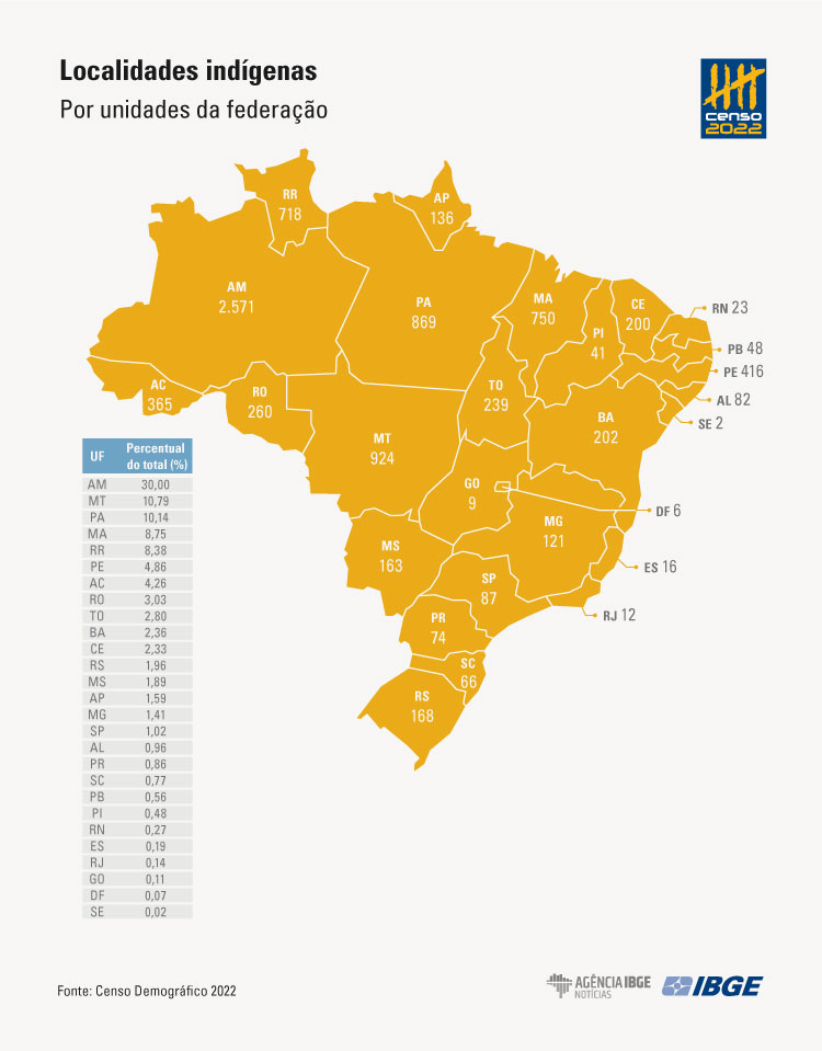 De acordo com o IBGE, existiam 8.568 localidades indígenas no Brasil em 2022, identificadas em todos os estados e no Distrito Federal. A maioria delas (71,55% ou 6.130) estava em terras indígenas declaradas, homologadas, regularizadas ou encaminhadas como reservas indígenas na data de referência do Censo, enquanto 2.438 (28,45%) localidades encontravam-se fora dessas áreas.