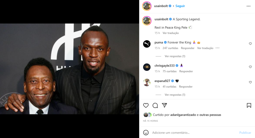 O jamaicano Usain Bolt, o homem mais rápido da história do atletismo, publicou uma mensagem em suas redes sociais na qual afirma: “Uma lenda do esporte. Descanse em paz Rei Pelé”. Já o inglês Lewis Hamilton, que é heptacampeão de Fórmula 1, agradeceu Pelé por ter compartilhado seu “talento, genialidade e amor”, e afirmou que seu legado será sempre uma inspiração.