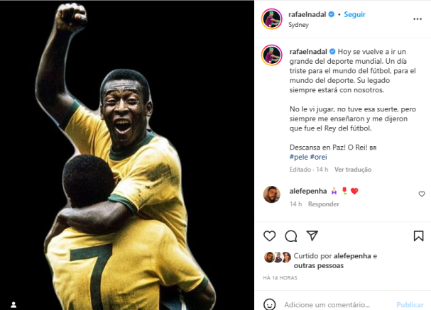 Outra estrela do esporte a destacar o legado do Rei do Futebol foi o tenista espanhol Rafael Nadal. Nas redes sociais ele declarou: “Hoje vai embora um grande do esporte mundial. Um dia triste para o mundo do futebol, para o mundo do esporte. Seu legado sempre estará conosco”.