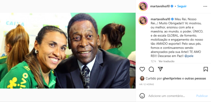 Entre os brasileiros não foi diferente, a atacante Marta, que foi eleita seis vezes como melhor jogadora do mundo pela Fifa, prestou sua homenagem a Pelé: “Meu rei, nosso rei. Muito obrigada! Você mostrou, ou melhor ensinou com arte e maestria, ao mundo o poder único e de escala global, de fomento, mobilização e engajamento do nosso tão amado esporte. Pelos seus pés, fomos e continuaremos sendo abençoados pela sua arte. Te amo rei. Descanse em Paz”.
