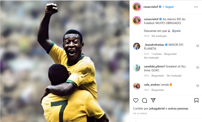 O campeão olímpico Cesar Cielo também expressou sua gratidão: “Ao eterno rei do futebol: muito obrigado”.
