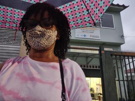 Embaixo de um guarda-chuva, disse que vai continuar seguindo todos os cuidados de higiene, como limpeza das mãos e uso de máscara. São quatro pessoas em sua casa e apenas ela está imunizada. A segunda dose já está agendada para daqui 15 dias. “Está certinho na carteirinha.”