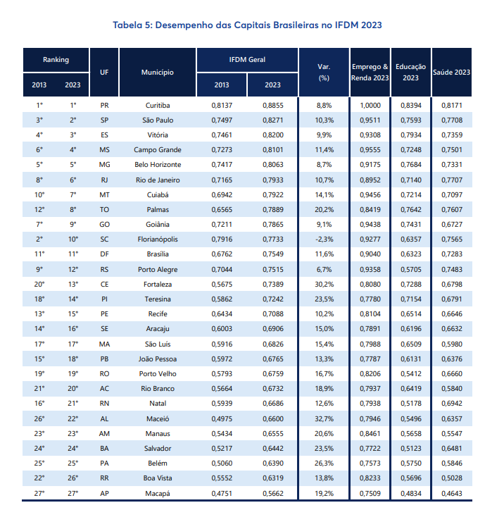 MANAUS (AM) – Manaus ocupa a 23ª posição entre as 27 capitais de Unidades da Federação (UF) com índices considerados moderados em relação ao desenvolvimento em saúde e educação, segundo o Índice Firjan de Desenvolvimento Municipal (IFDM) de 2025, divulgado no início deste mês. Entre as 5.550 cidades do Brasil, Manaus ocupa o 2.072º lugar do mesmo índice.