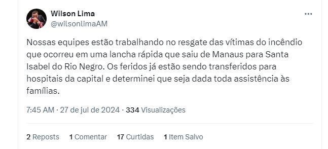 O governador do Amazonas, Wilson Lima (União Brasil) se manifestou neste sábado em uma rede social. Ele reforçou que o Governo do Estado prestará toda assistência às famílias e reafirmou que as equipes de resgate atuam na transferência das vítimas do local do incêndio para Manaus.
