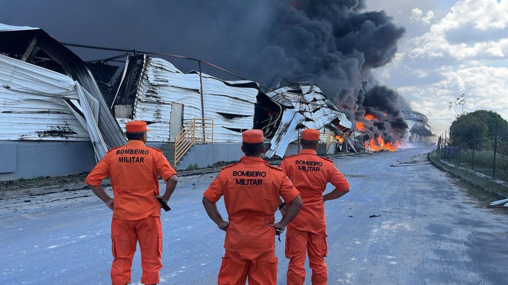 “O sinistro ainda não foi controlado, tendo em vista que o material das edificações é composto por veículos e seus componentes plásticos, pneus, combustíveis e material plástico industrial, altamente tóxico e inflamável”, diz a corporação.