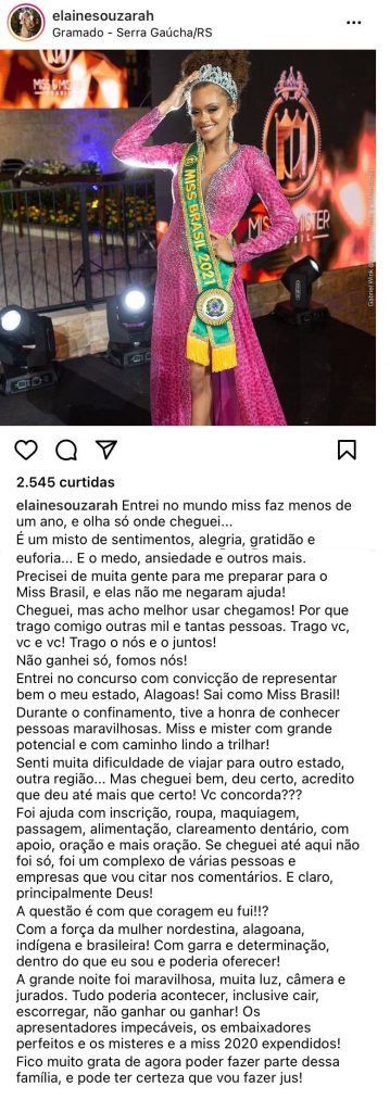 “Entrei no mundo miss faz menos de um ano, e olha só onde cheguei. É um misto de sentimentos, alegria, gratidão e euforia… E o medo, ansiedade e outros mais. Precisei de muita gente para me preparar para o Miss Brasil, e elas não me negaram ajuda! Cheguei, mas acho melhor usar chegamos! Porque trago comigo outras mil e tantas pessoas. Trago você, você e você! Trago o nós e o juntos! Não ganhei só, fomos nós!”, declarou Elâine, em uma publicação no Instagram.